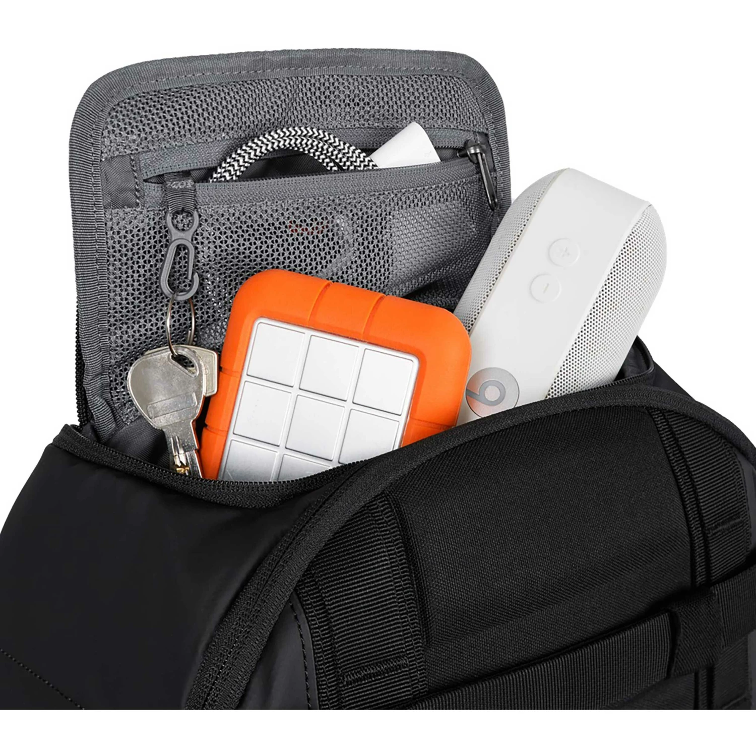 - Øverste lomme: rummelig lomme med et nethylster og en nøglekrog giver hurtig adgang til dine vigtigste ting