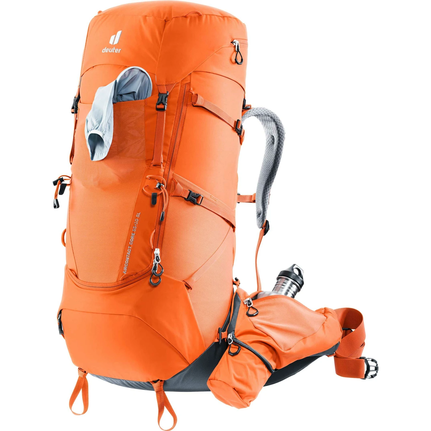 - To store aftagelige hoftefinnelommer med lynlås (3 L) til ting, du har brug for på farten – højre lomme har også en 1,5 liters flaskeholder med lynlås (udelukkende i 55 + 10 SL til 70 + 10 Core-volumenerne)