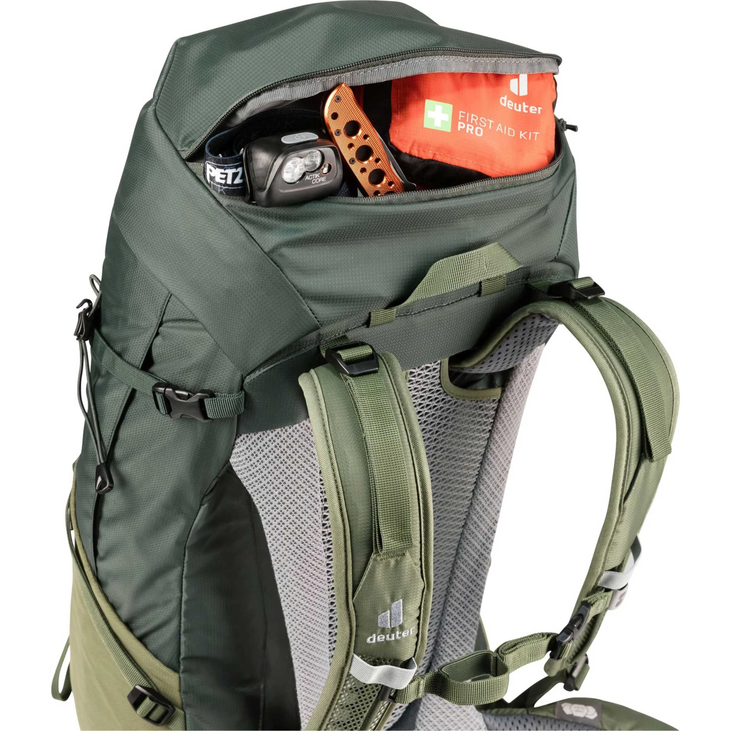 Deuter Futura Pro 40 er gennemtænkt i alle detaljer og er udviklet til flerdagsture, hvor komforten ikke må mangle. Vandrerygsækken har derfor det ergonomiske Aircomfort Sensic Pro mesh rygsystem. Det giver maksimal ventilation i ryggen takket være det innovative net. Desuden giver de bevægelige VariFlex ECL-hoftefinner med ergonomiske polstrede indsatser mulighed for energibesparende transport. Takket være den klare opdeling af rummene kan genstande nemt og effektivt opbevares i lågrummet, i sidelommerne med bælge, i det separate bundrum og i det rummelige hovedrum.