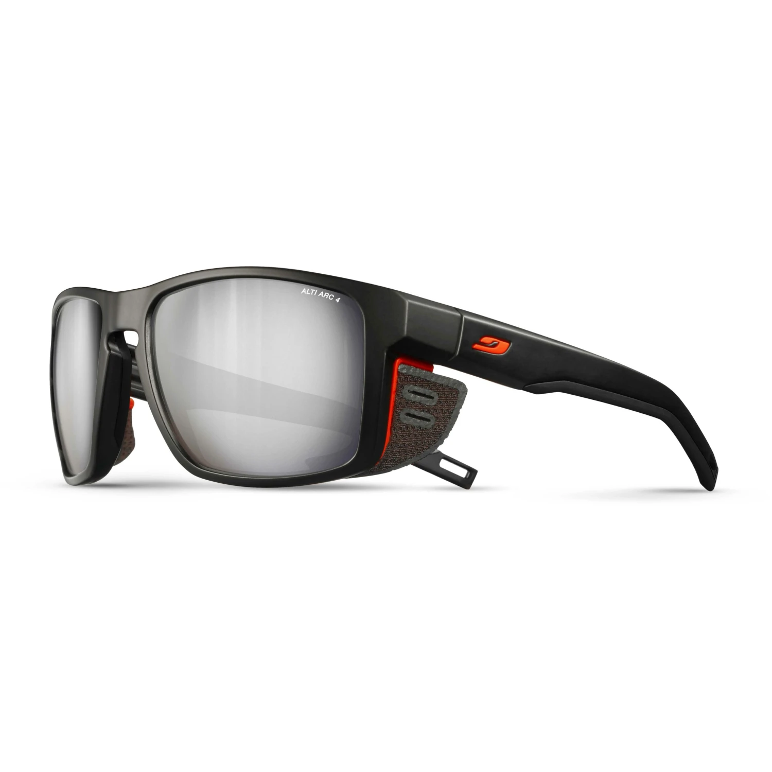 Den stilfulde Julbo Shield er lavet til dig, der klatrer, løber eller cykler i bjergene. I næsten alle terræner kommer disse solbriller til deres ret. De Reactiv fotokromiske linser sikrer et klart syn, og de skridsikre buede ben med Grip Nose sikrer, at Julbo Shield bliver siddende på dit hoved, uanset hvilken sport du dyrker! Air Flow-ventilation og aftagelige soft-touch-sidehætter sikrer maksimal komfort og beskyttelse mod de hårdeste forhold. Den slanke rektangulære form sikrer, at stil og dristige bevægelser går hånd i hånd.