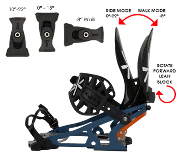 At spare på energien i backcountry kan være forskellen mellem at tage en ekstra omgang, tage en længere tur eller tage hjem, fordi du er helt udkørt. Alle Karakoram splitboardbindinger leveres som standard med patenteret Ride-Stride forward lean med en Walk Mode og en Ride Mode for at hjælpe dig med at spare energi, uanset om du er på tur eller ridning. Walk Mode har en -8° forward lean-indstilling for at hjælpe dig med at gå længere med hvert skridt, fordi highback’en ikke skubber mod din læg. Ride Mode giver dig mulighed for at forudindstille din fremadrettede hældning mellem 0° og 22° i trin på 2° for at give dig en bedre løftestangseffekt i dit sving på hælen og gøre din tur nedad mere kraftfuld og behagelig. Med Ride-Stride-teknologien behøver du ikke at pille ved små dele, mens dine hænder er kolde, for at justere din fremadrettede hældning, du skal blot dreje justeringsenheden for fremadrettet hældning 90° mellem Walk Mode og din forudindstillede Ride Mode – sæt og glem det. Ride-Stride er den hurtigste og letteste justering af fremadrettet hældning, der findes.