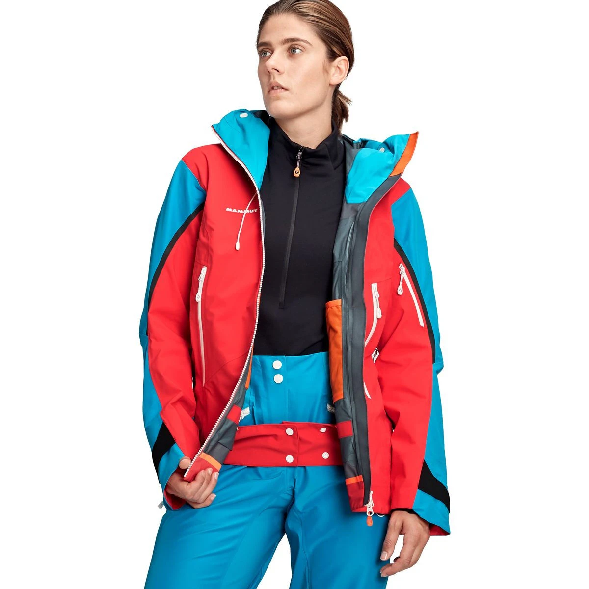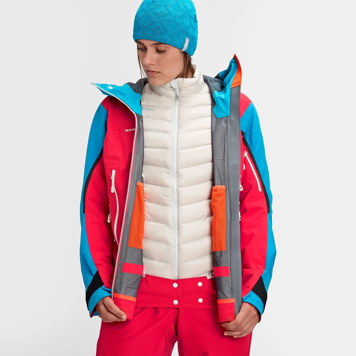 Nordwand Pro har en stormsikker, hjelmkompatibel hætte, der nemt kan justeres lodret og vandret, selv når du har handsker på. Vandtætte, klatresele-kompatible udvendige lommer, to store indvendige lommer, et aftageligt sneskørt og ventilation under armene opfylder ethvert tænkeligt behov. Designet af Nordwand Pro HS Hooded Jacket Women er afrundet af detaljer af høj kvalitet såsom Hypalon-krog- og løbeslutninger.