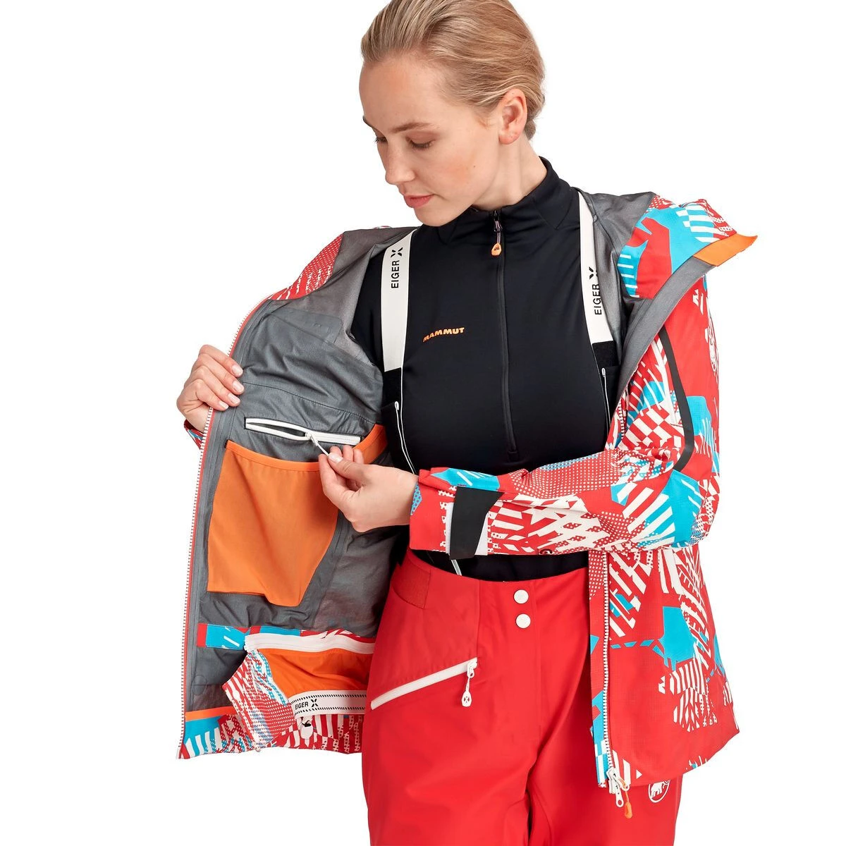 Nordwand Visiflage har en stormsikker, hjelmkompatibel hætte, der nemt kan justeres lodret og vandret, selv når du har handsker på. Vandtætte, klatresele-kompatible udvendige lommer, to store indvendige lommer, et aftageligt sneskørt og ventilation under armene opfylder ethvert tænkeligt behov. Designet af Nordwand Visiflage HS Hooded Jacket Women er afrundet af detaljer af høj kvalitet såsom Hypalon-krog- og løbeslutninger.