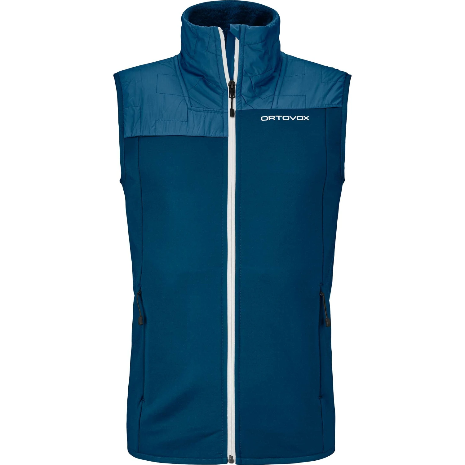 Ortovox Fleece Plus Vest Men er en varm, funktionel og let vest, selv på iskolde freeridedage.Den ideelle materialekombination af varm Merino Fleece Plus med merinould, genbrugspolyester og elastisk Tec Stretch giver vesten en behagelig bevægelsesfrihed og høj komfort. Den smarte placering af det quiltede, elastiske og vindafvisende Tec Stretch-materiale ved skuldrene gør også vesten robust og holdbar. Blød merinofleece på indersiden regulerer naturligt dit kropsklima og føles behageligt på huden. 2 sidelommer med skjulte lynlåse holder dine hænder dejligt varme og giver masser af plads til de små nødvendigheder, som du har brug for inden for rækkevidde.