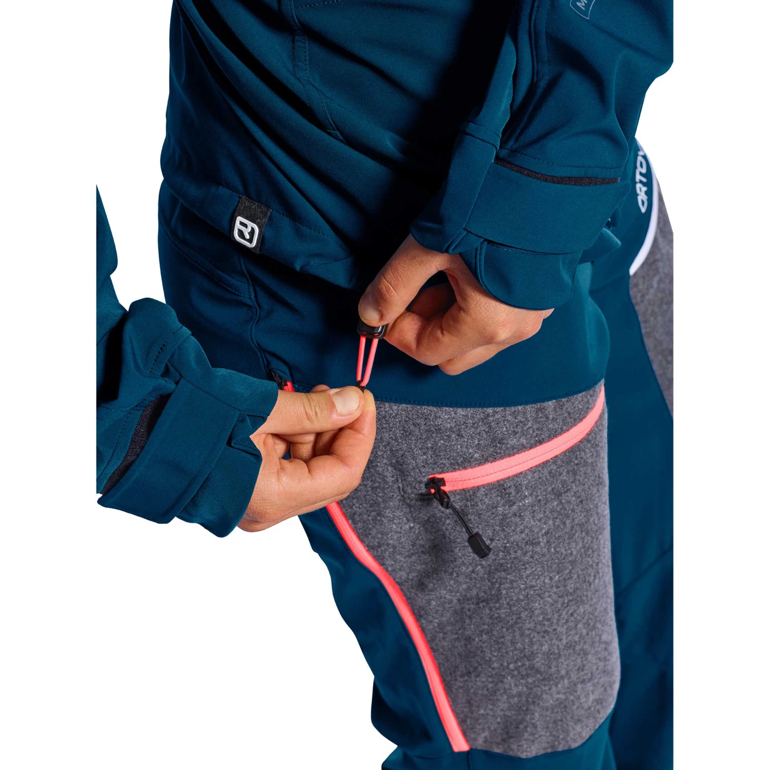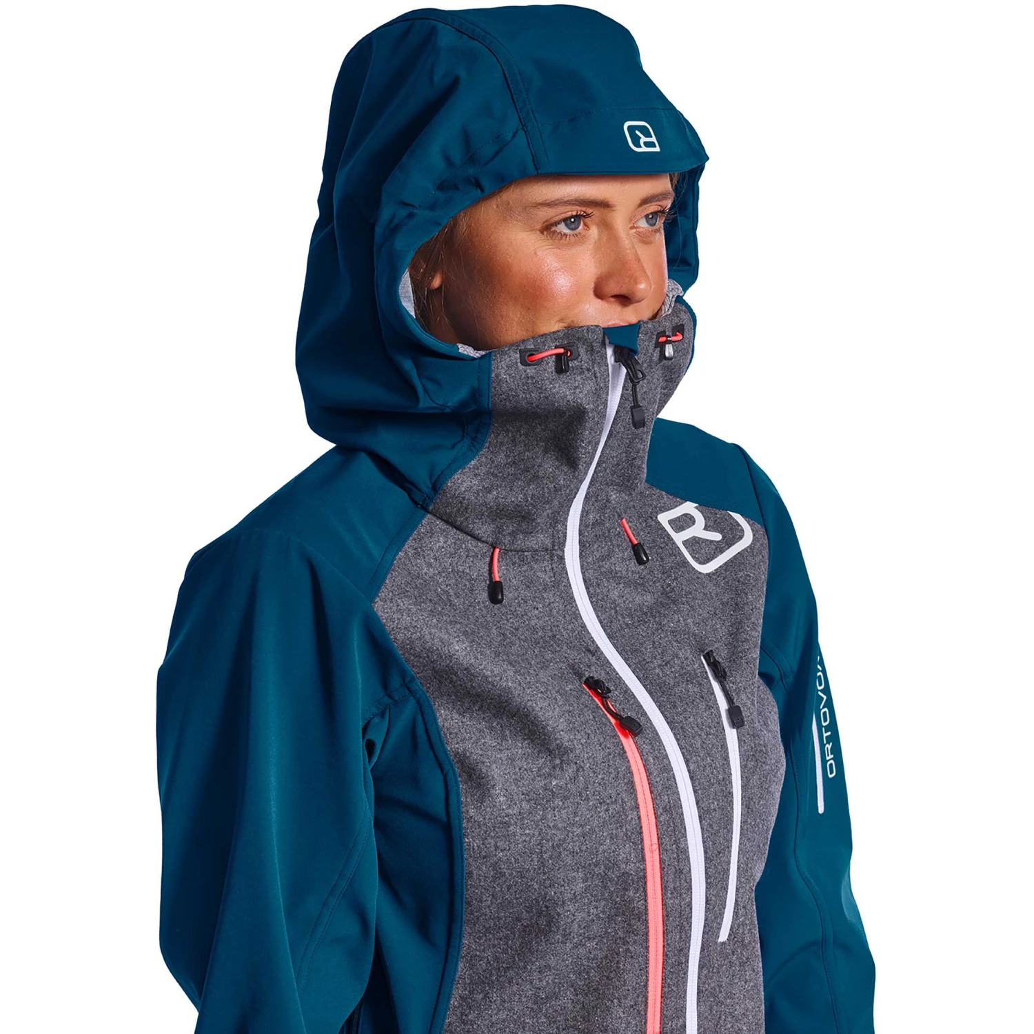 Når det er koldt, lukker membranen på Pordoi Jacket W sig selv – så snart kroppen bliver for varm, åbner den porerne for at regulere temperaturen og svedproduktionen. Skallen af polyamid og elastan holder omverdenen … udenfor. Dette sammensurium af fibre imponerer med sin elasticitet og robusthed; det holder vinden udenfor og er vandafvisende. Ortovox uld-DNA er tydeligt i Loden-materialet, som er delvist indsat og underlagt med membran. Ortovox er uld!