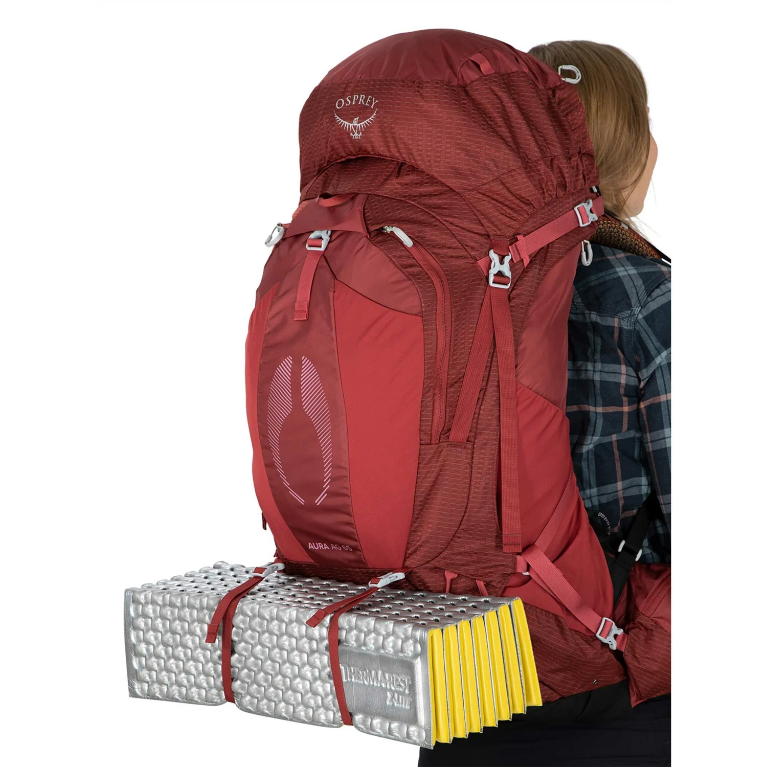 Tag tunge weekender eller ugelange rygsækrejser med tyngdekraften troddende komfort og førsteklasses ventilation med Osprey Aura AG 65. Den innovative AntiGravity-ophængning og -sele med en kvindespecifik pasform giver en sømløs pasform, der omslutter din ryg og dine hofter i 3D-ophængt mesh. Aura AG 65 er en kompromisløs rygsækpakke til kvinder, der er let at bruge, med sidelommer i stretchnet, Stow-on-the-Go fastgørelse af vandrestave og integreret regnslag. Fremstillet af 100 % genbrugsmaterialer.