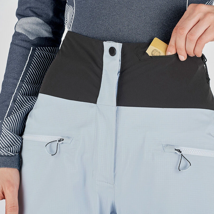 Salomon Outpeak 3L Light Pant til kvinder er udstyret med ultralet Pertex® Shield og er let at lægge i flere lag til aktiviteter i bjergene, f.eks. skiture. Det slidstærke 20k/20k-stof giver varig vejrbeskyttelse, mens praktiske detaljer som justerbare nederste søm, kroge på den indre gamache og kompatibilitet med seler betyder, at den også er ideel til bjergbestigning.