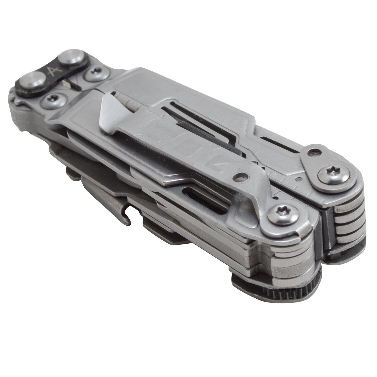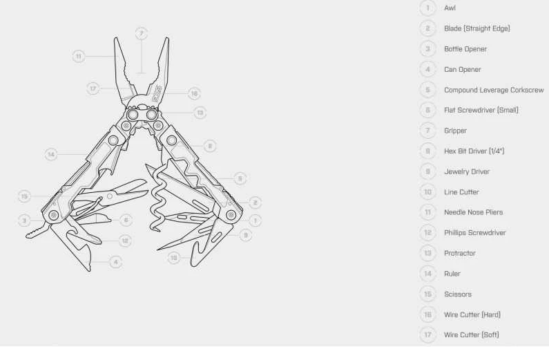 - Værktøjsantal 17: Flaskeåbner, AWL, dåseåbner, korkskrue med sammensat løftestang, griber, hård trådskærer, nåletang, Philips-skruetrækker, vinkelmåler, lineal, lineal, saks, lille flad skruetrækker, blad med lige kant, centreret magnetisk 1/4″ Hex bit driver, smykkedriver, linjeskærer, blød trådskærer