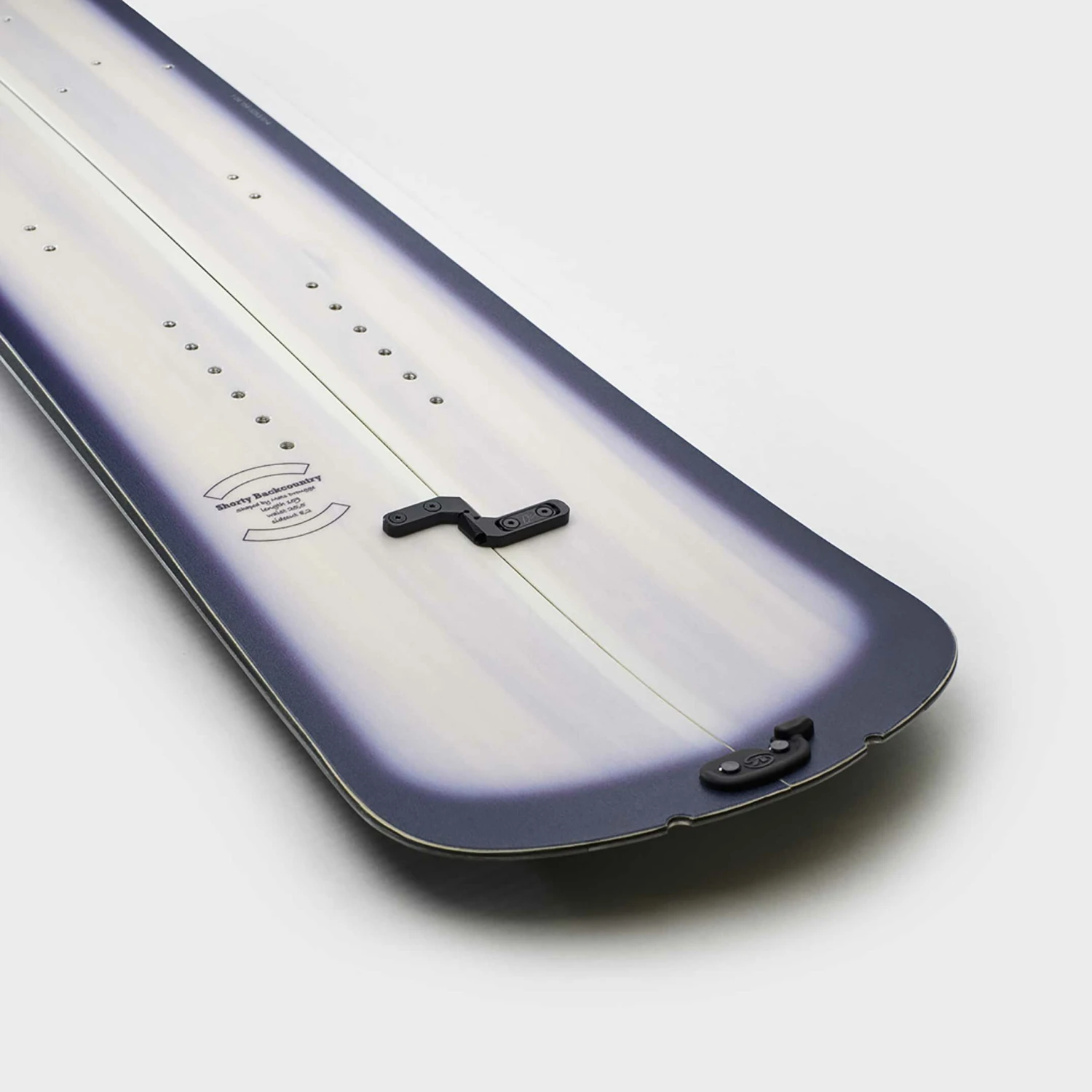 De neus is breder dan de tail. Hierdoor zinkt het board aan de achterkant. Dit creeert float en rijdt heerlijk in de poeder.