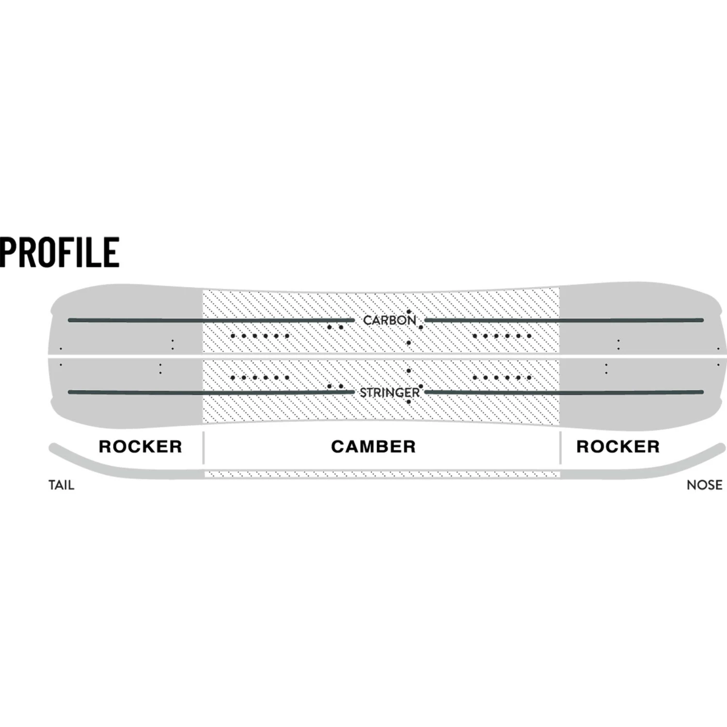 Een groot cambergedeelte in het midden van het board wordt bij gestaan door een agressievere radius naar achteren. Gecombineerd met rocker in de tip en tail voor extra pop en float. En dan met behoud van het gevoel van grip op je kanten, zoals bij echte camber.
